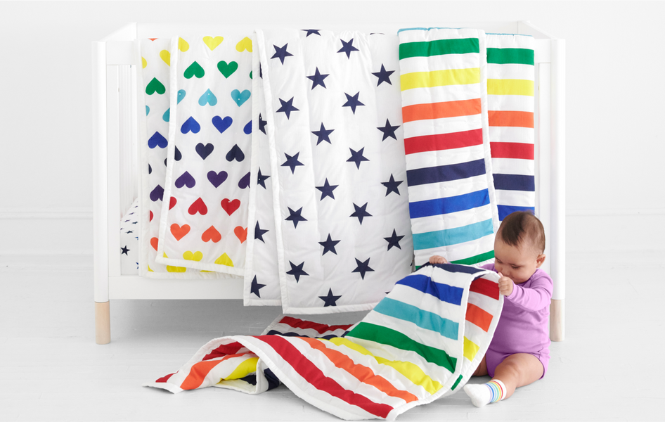 Mix-and-match bedding in signature stripes, hearts, and stars.