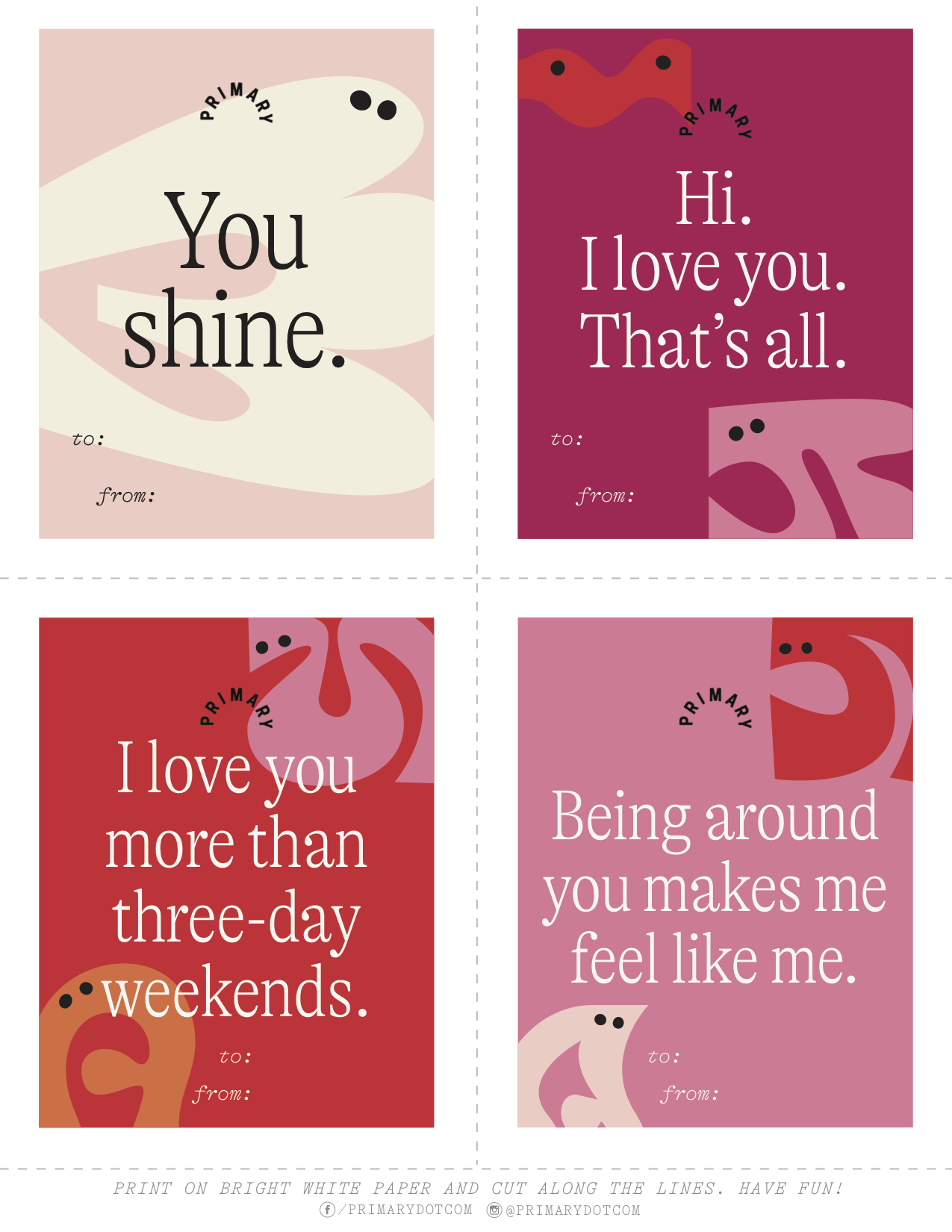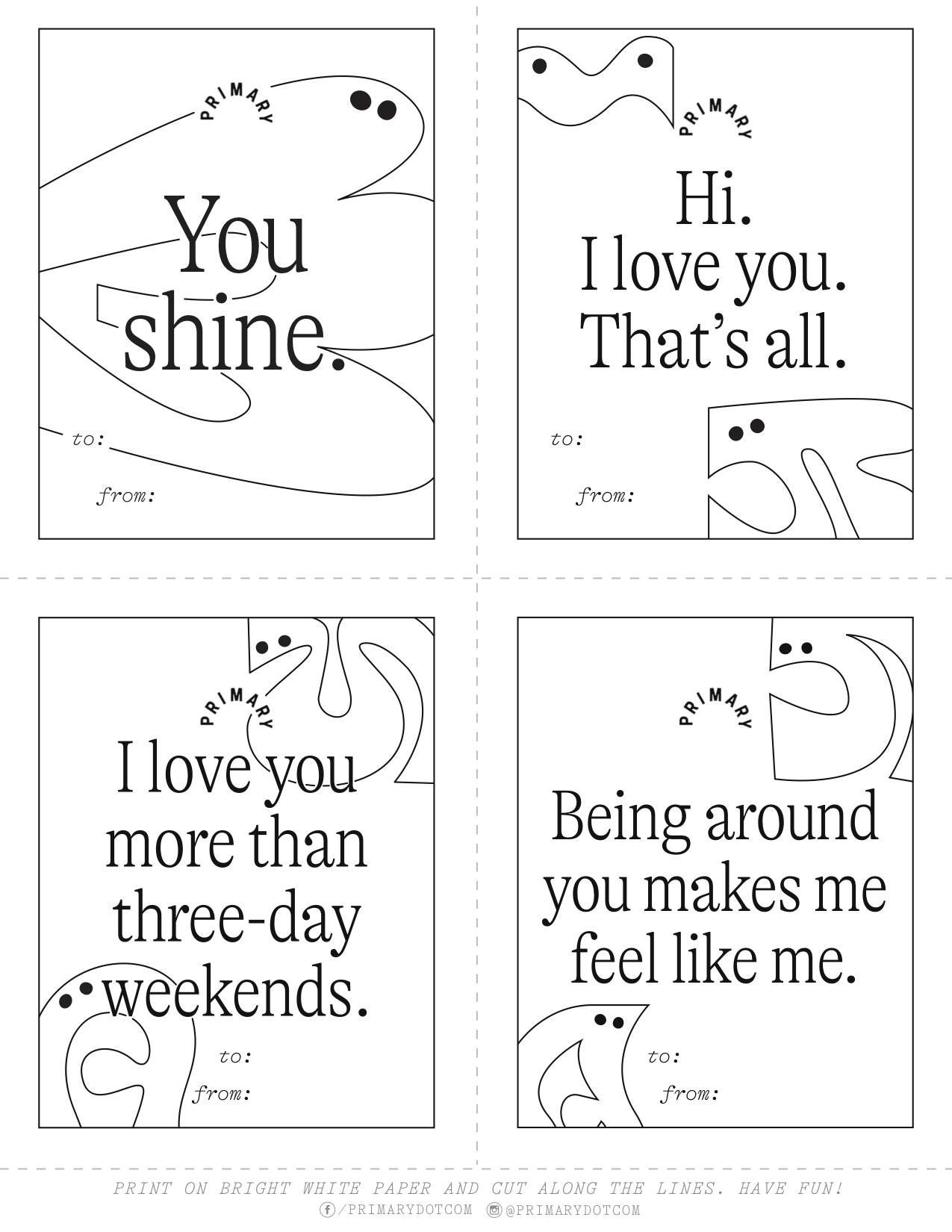 Valentine's Day is almost here, and our hearts are full for two reasons: heart styles for the whole family are 25% off AND we made free Valentine's Day cards and coloring sheets that you can print and fill in at home. Skip a trip to the store and download the templates below, ready for kids and grownups alike. All you need to do is print, fill them in as you please, and share! Click on the links below each image to download, and have a very happy Valentine's Day.